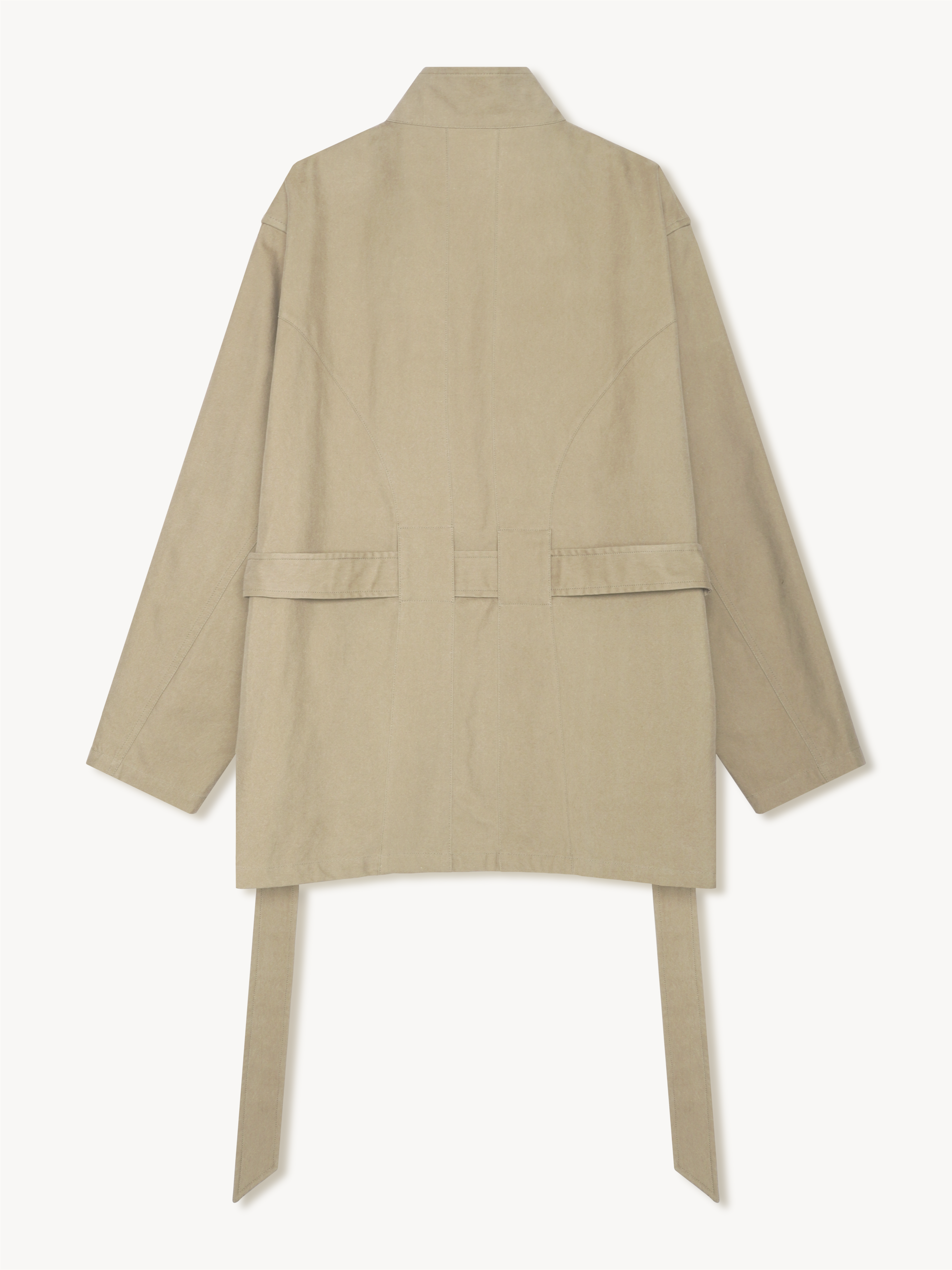 Jacket made with brushed cotton twill. The garment features a belted detail at the waist and collar, complemented by a zip and buttoned closure. This garment has undergone a special treatment.
