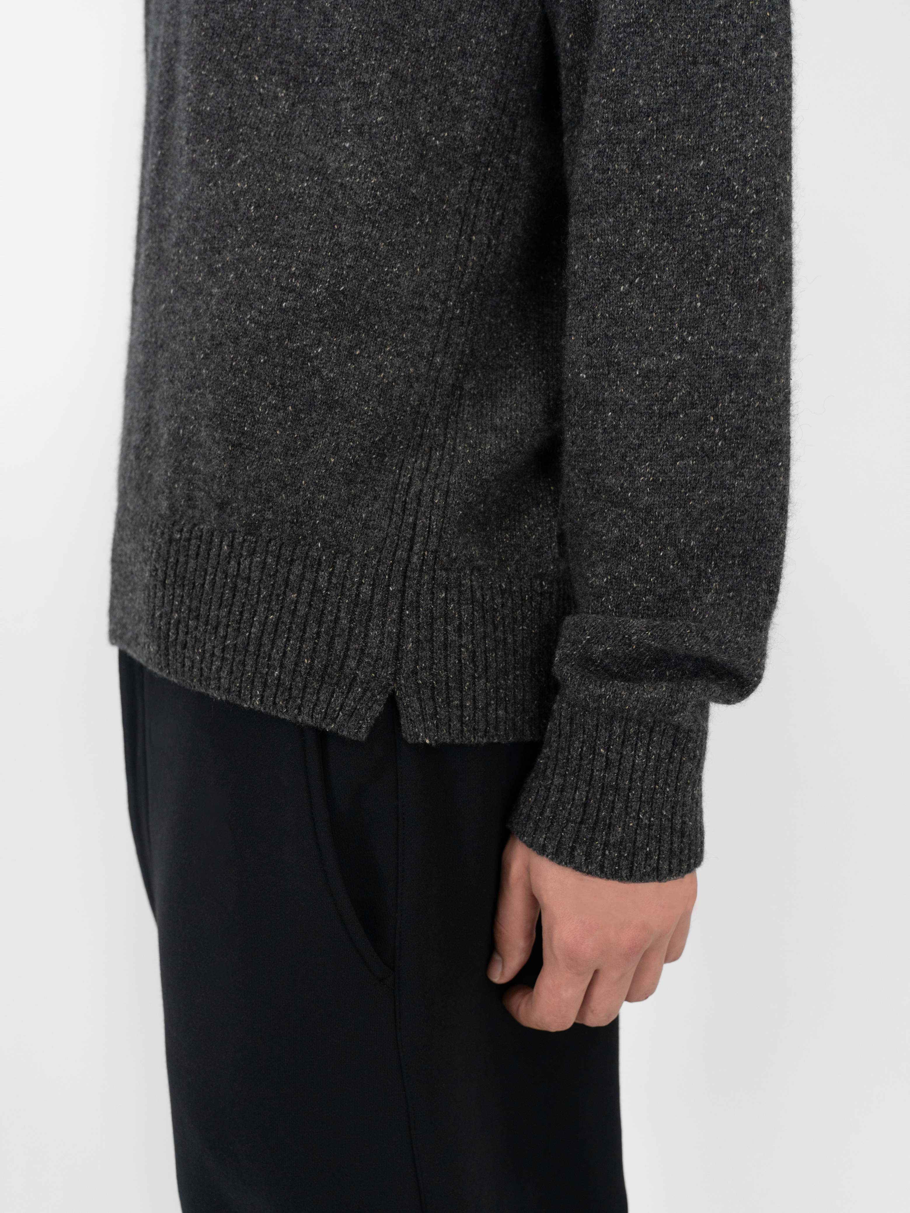 Silk, Wool, and Cashmere fibers are combined and then knitted, a process where yarn is looped and interlaced to create a fabric with a characteristic texture and drape. The combination of these fibers results in a garment that is both soft and comfortable to wear. Cashmere and wool contribute to the garment’s ability to keep you warm, while the silk contributes to the texture and a flowing drape to the fabric.