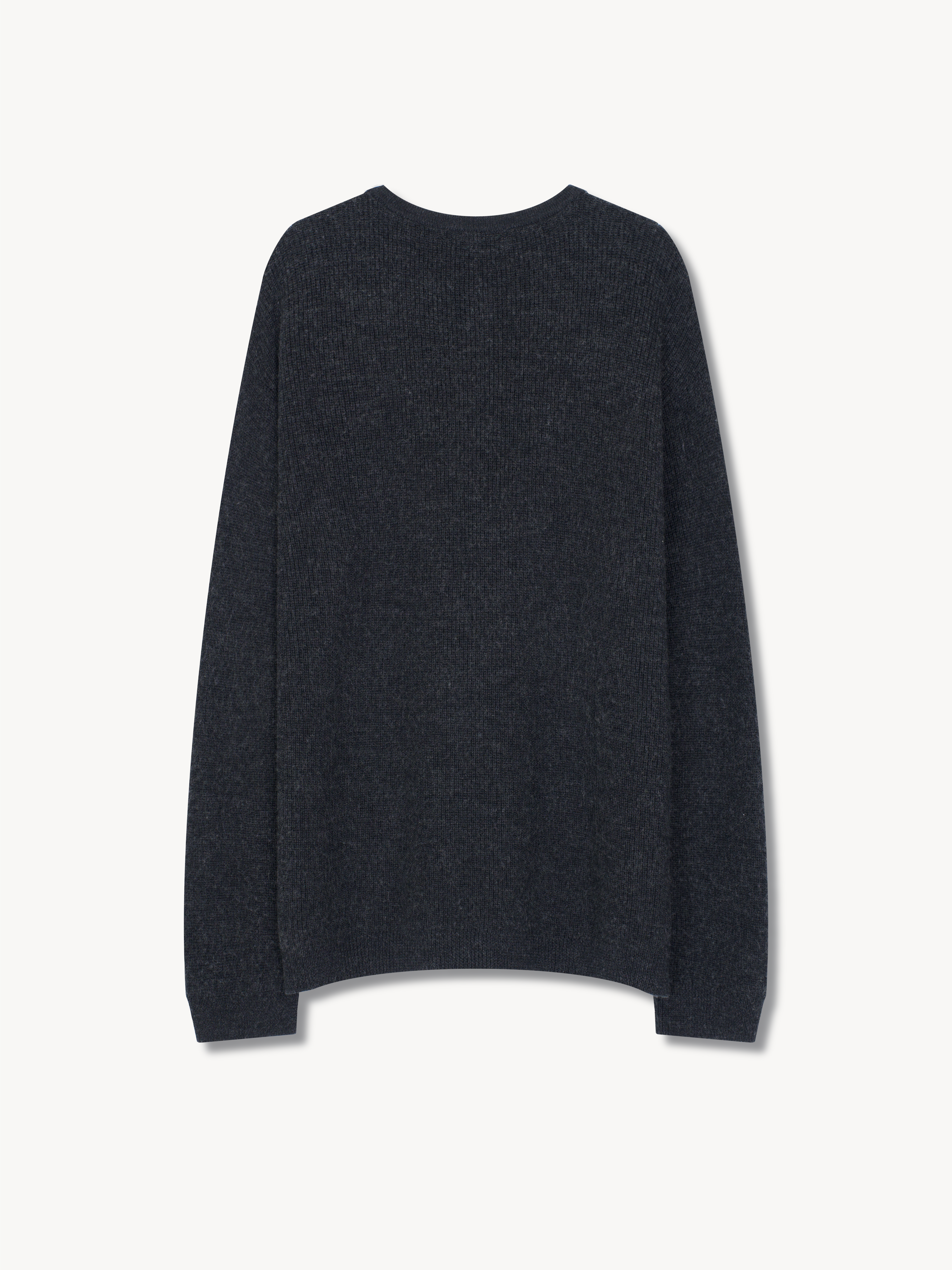 Henley knit top made with suvin cotton and super fine wool blend. The sweater features side slits and ribbed finish at the sleeves and hem.