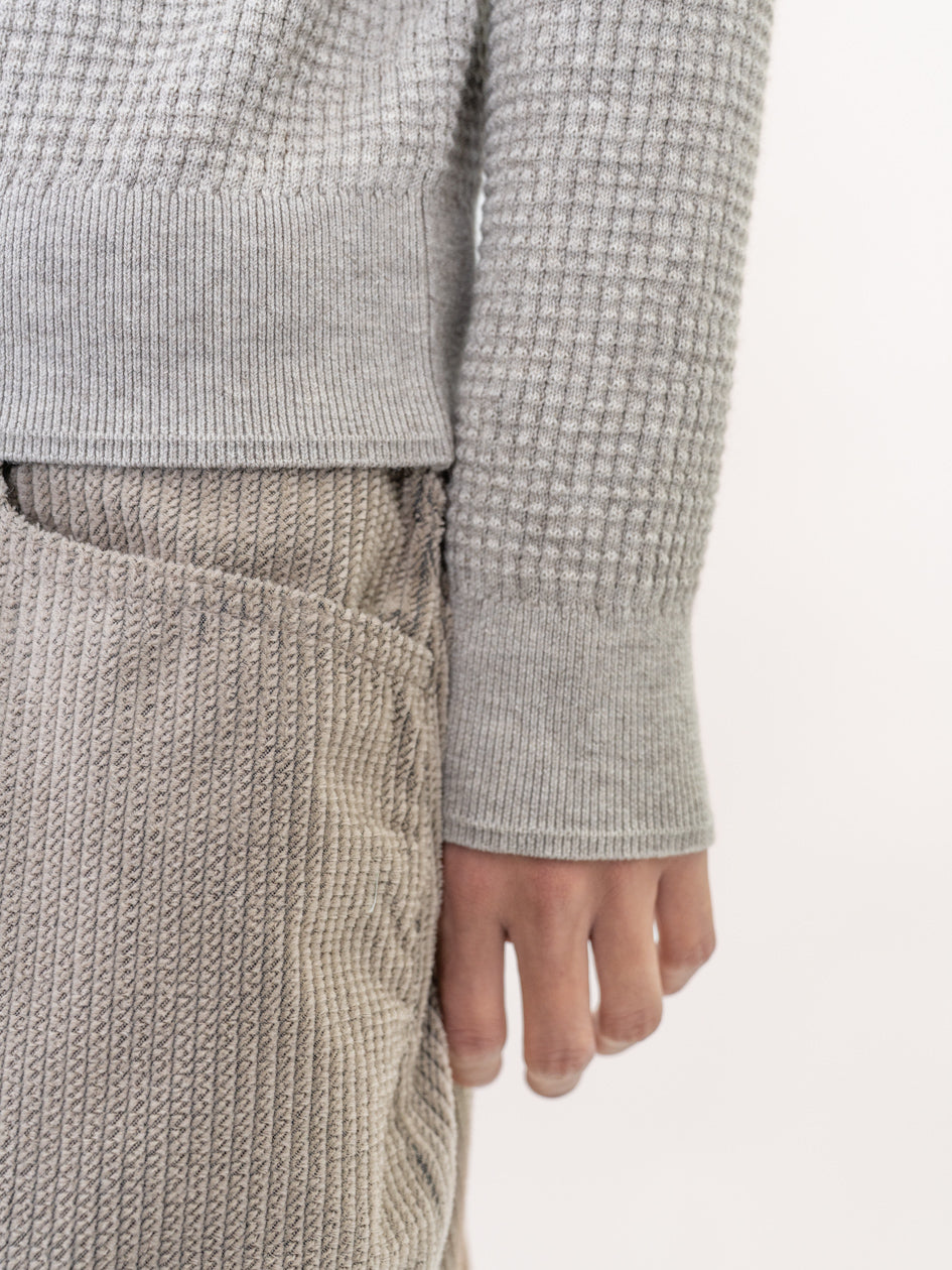 Cotton-Yak is a wool blend composed of 80% cotton and 20% yak wool known for its soft, all-season suitability. Yak wool has excellent heat retention and moisture absorption/release properties, so it is not only warm but also comfortable and does not get stuffy. This wool blend is great for transitional seasons when the climate is more volatile. The waffle pattern is carefully thought out to provide enough breathability while also reserving heat.