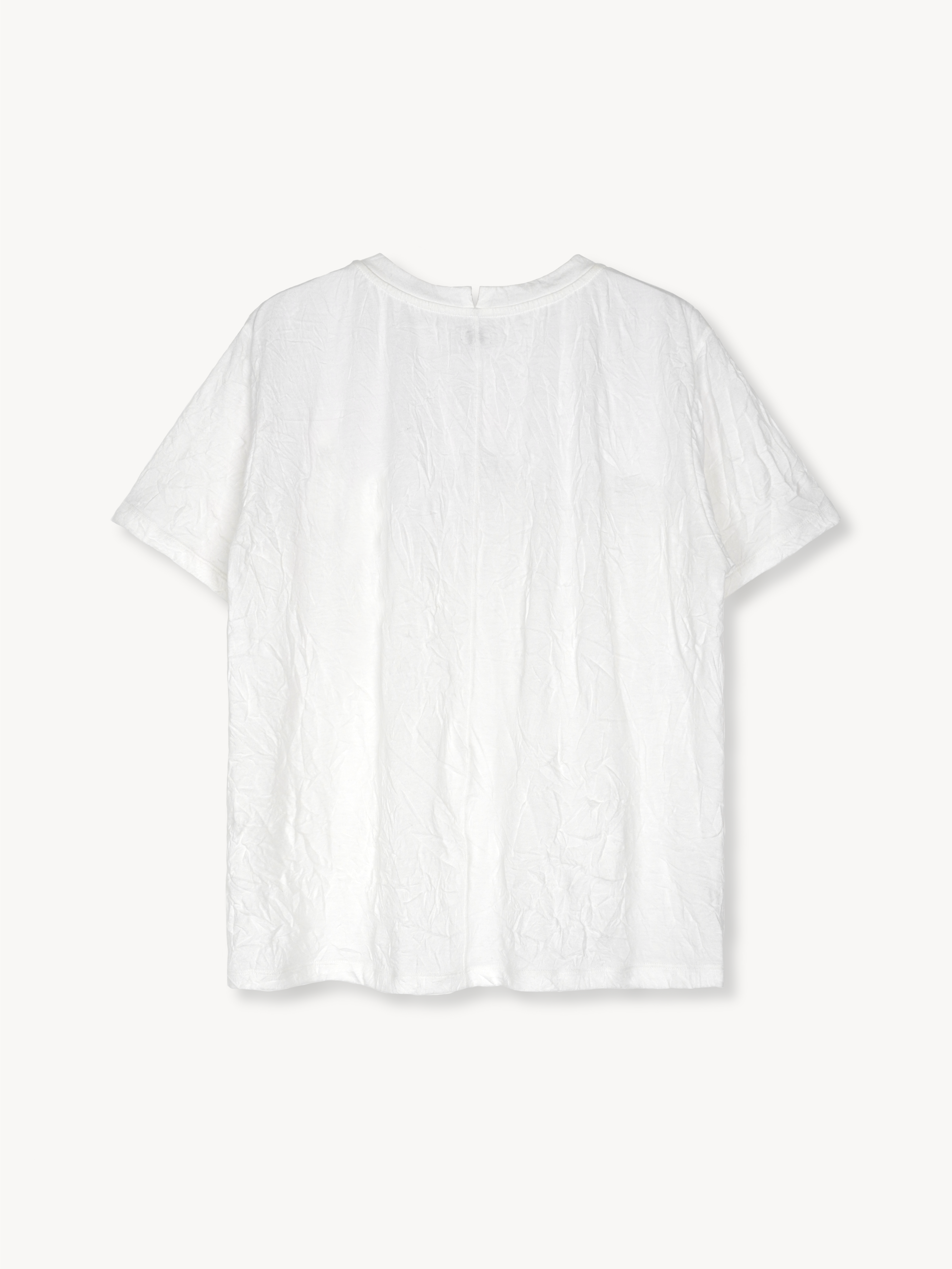 Standard, short-sleeved t-shirt in soft crushed cotton polyester blend jersey with ribbed crewneck, front chest patch pocket, and center collar slit and back detail.