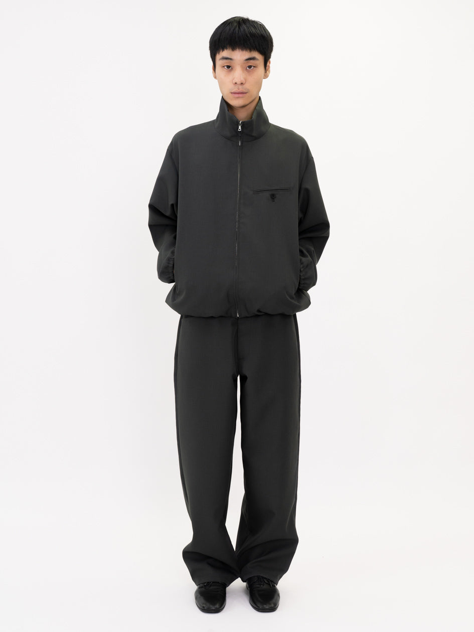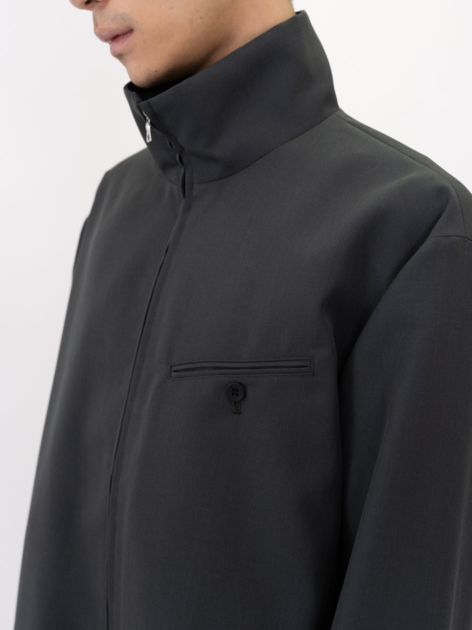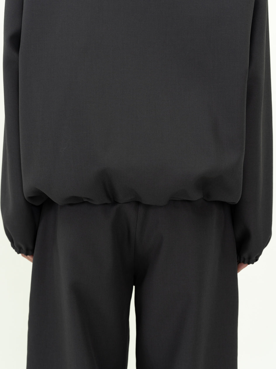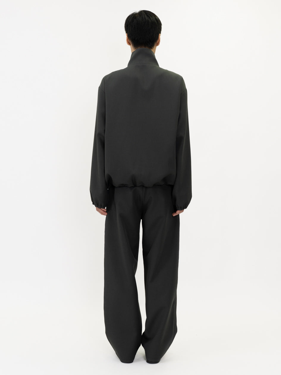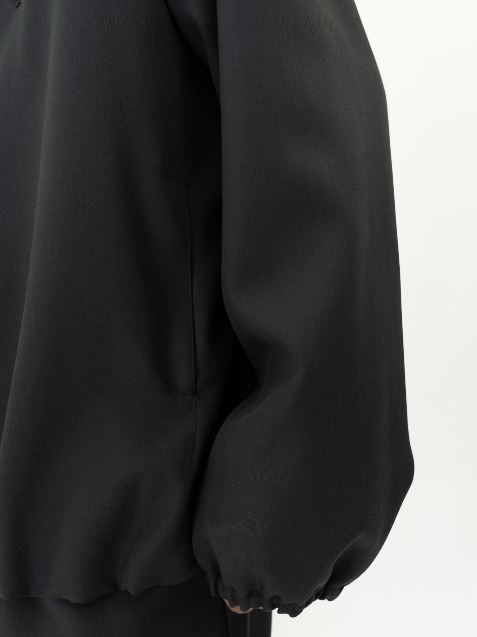 The caviar blouson is executed with ruching from both the interior and exterior, yielding a visually appealing drape throughout the garment. The fabric is a virgin wool and polyester blend with soft viscose lining on the inside of the garment. Two darted pockets on the sides create for a seamless and refined silhouette.