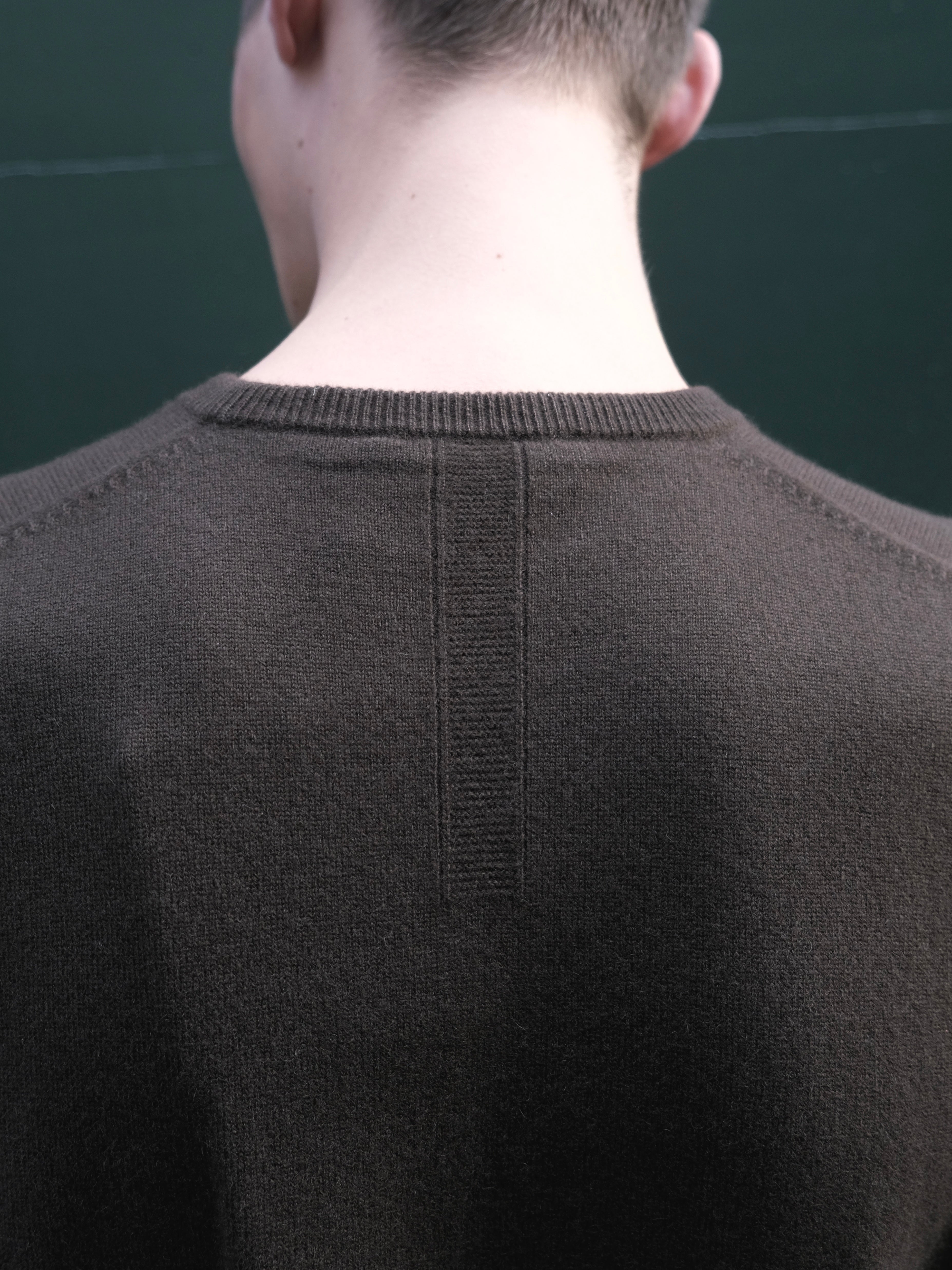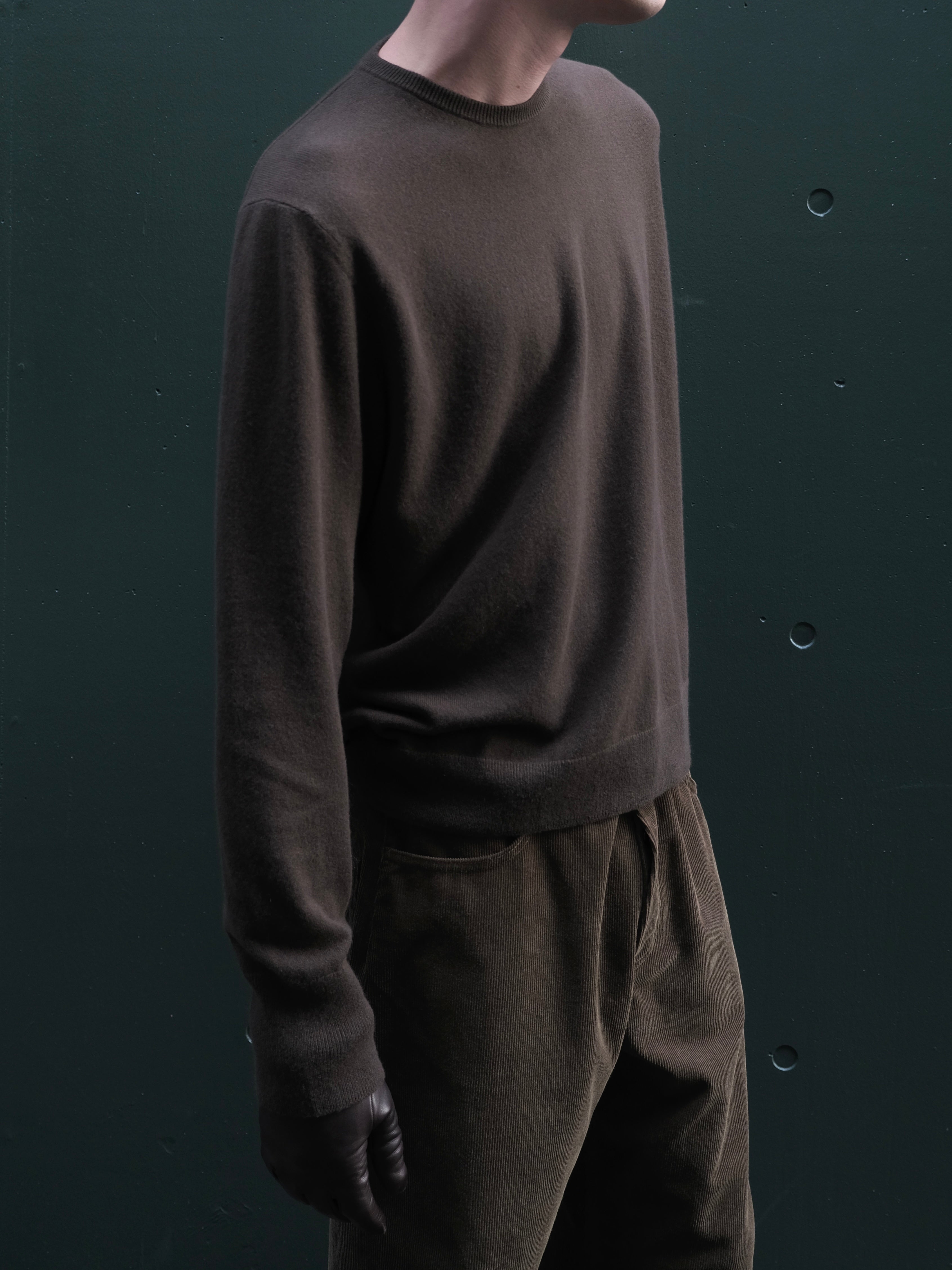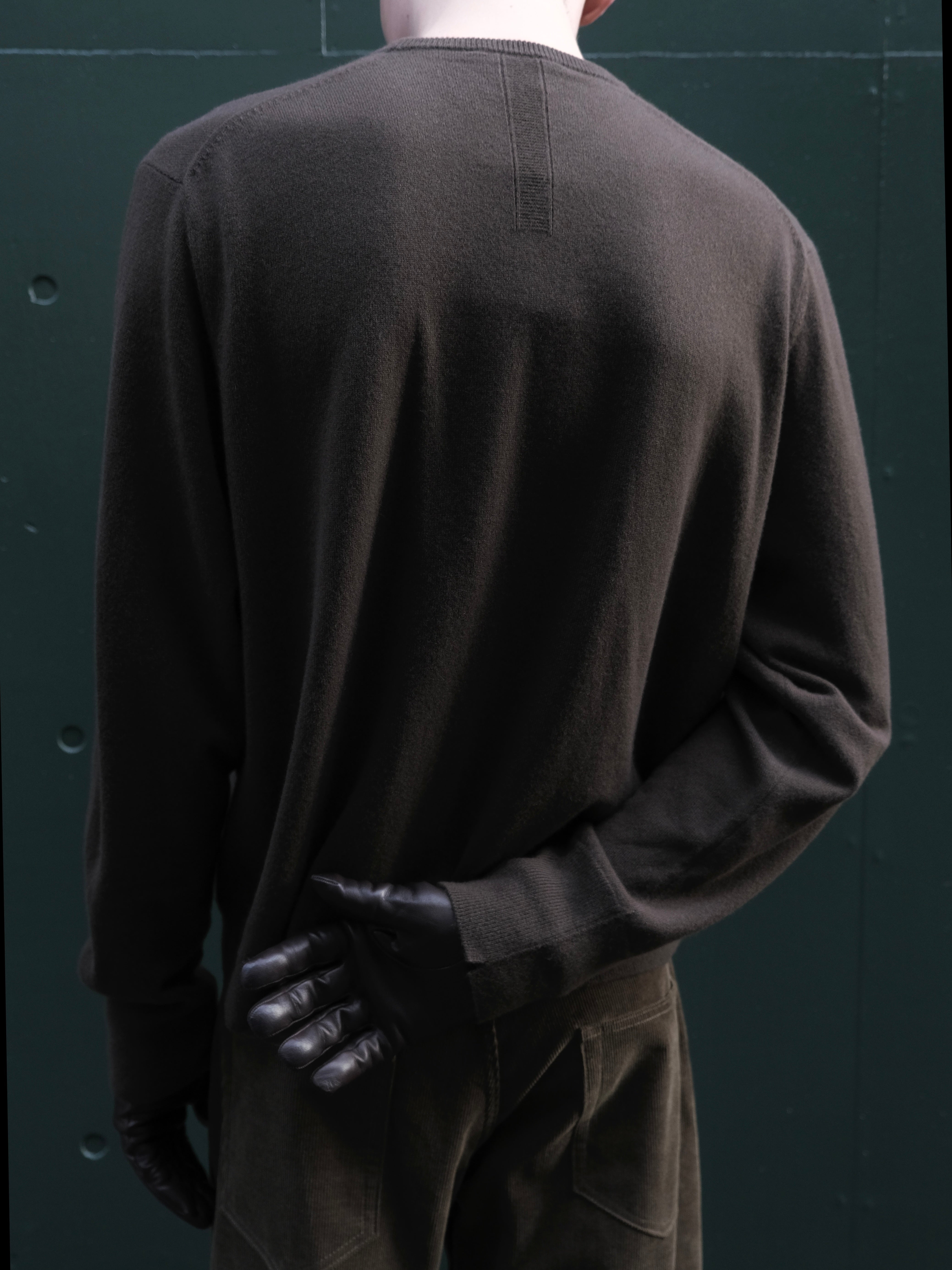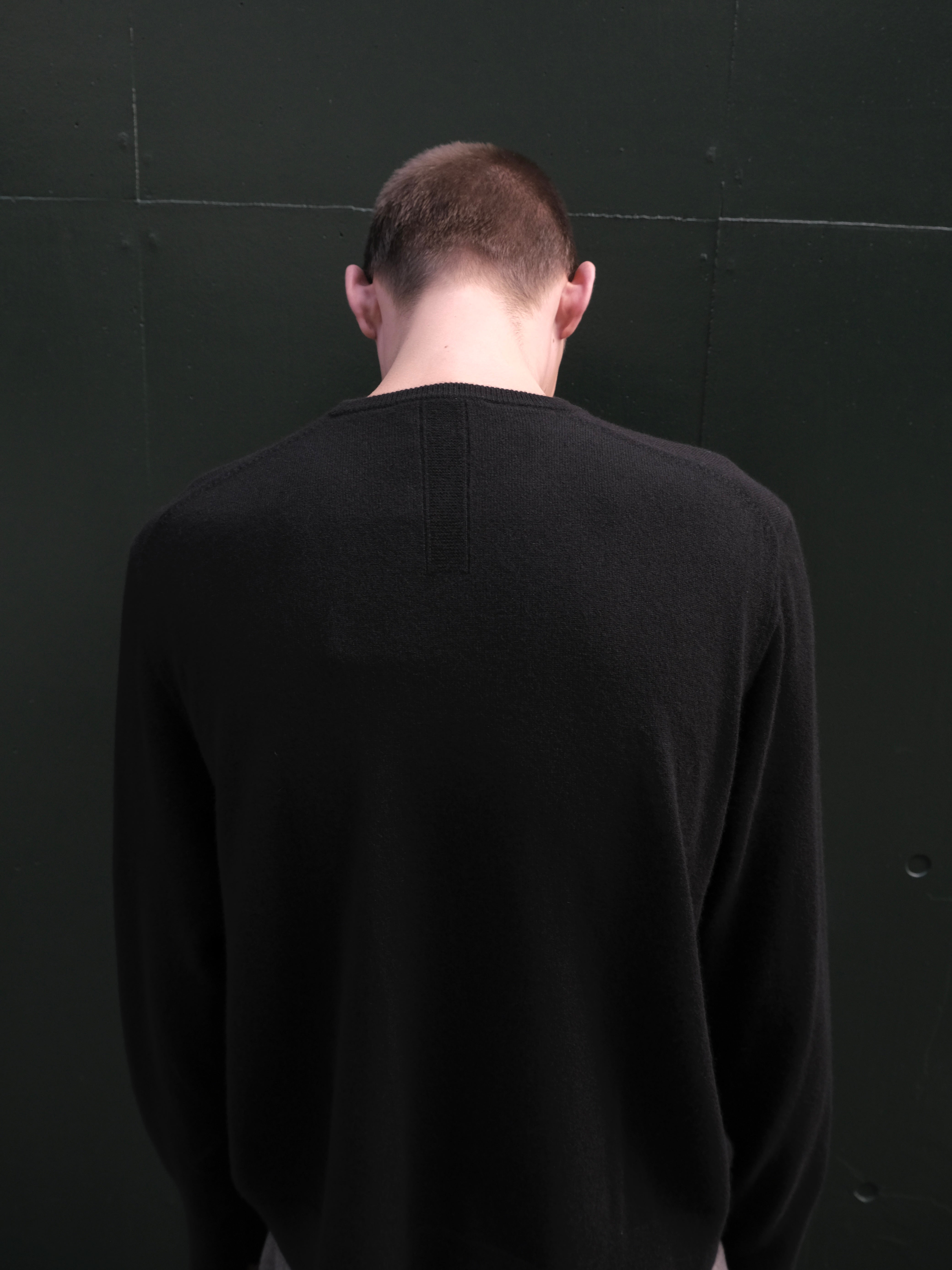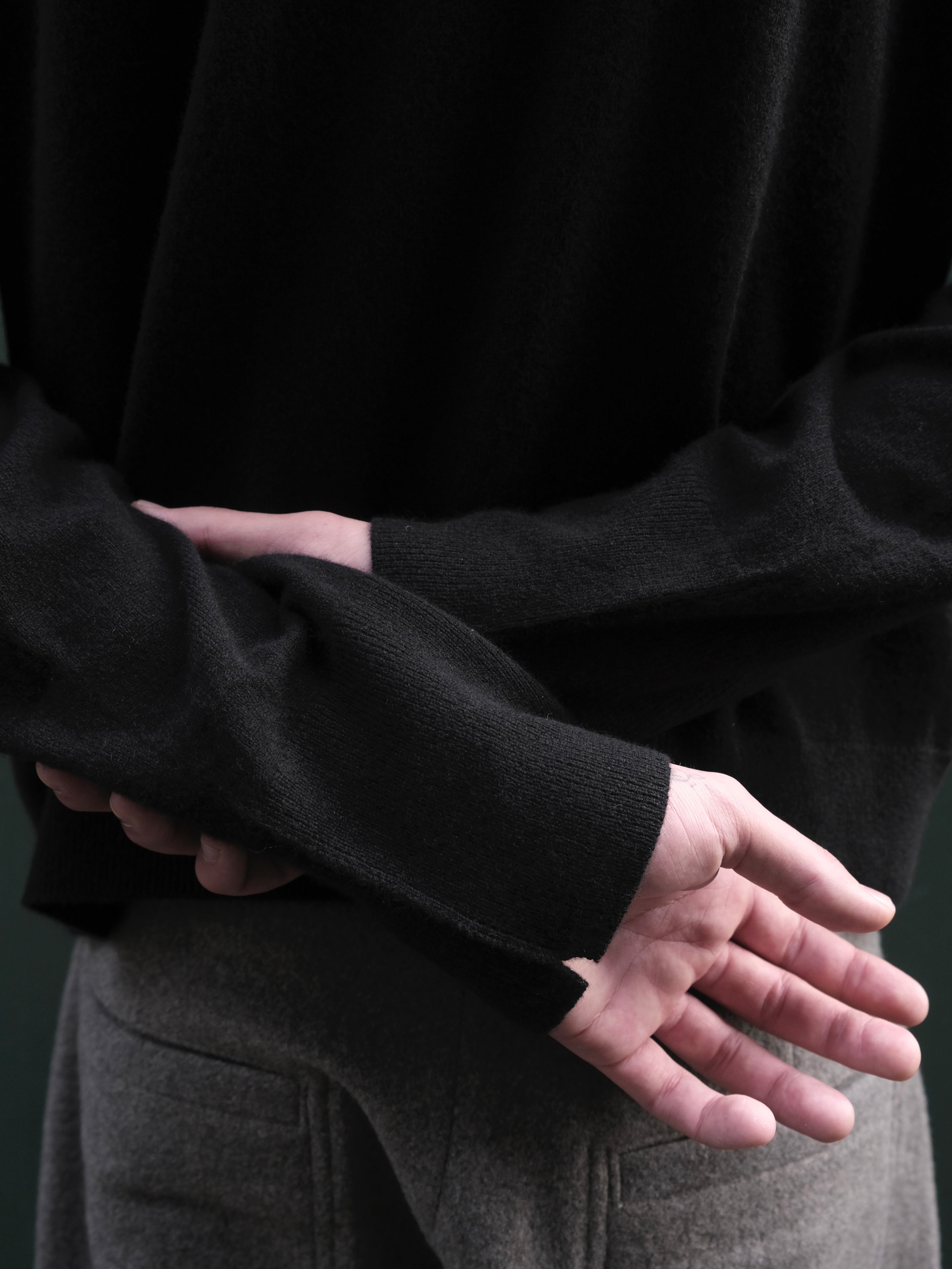 The everyday knit sweater is meticulously made with baby cashmere in three color ways: Brown, Grey, and Black. Baby cashmere is a material produced with the fleece of the white hircus goat, an animal that lives exclusively in Alaskan. Baby cashmere is rarer than adult fleece and 15% finer than the finest cashmere, and is considered the most high-end cashmere yarn. The everyday sweater features slit cuffs and a back tab detailing.