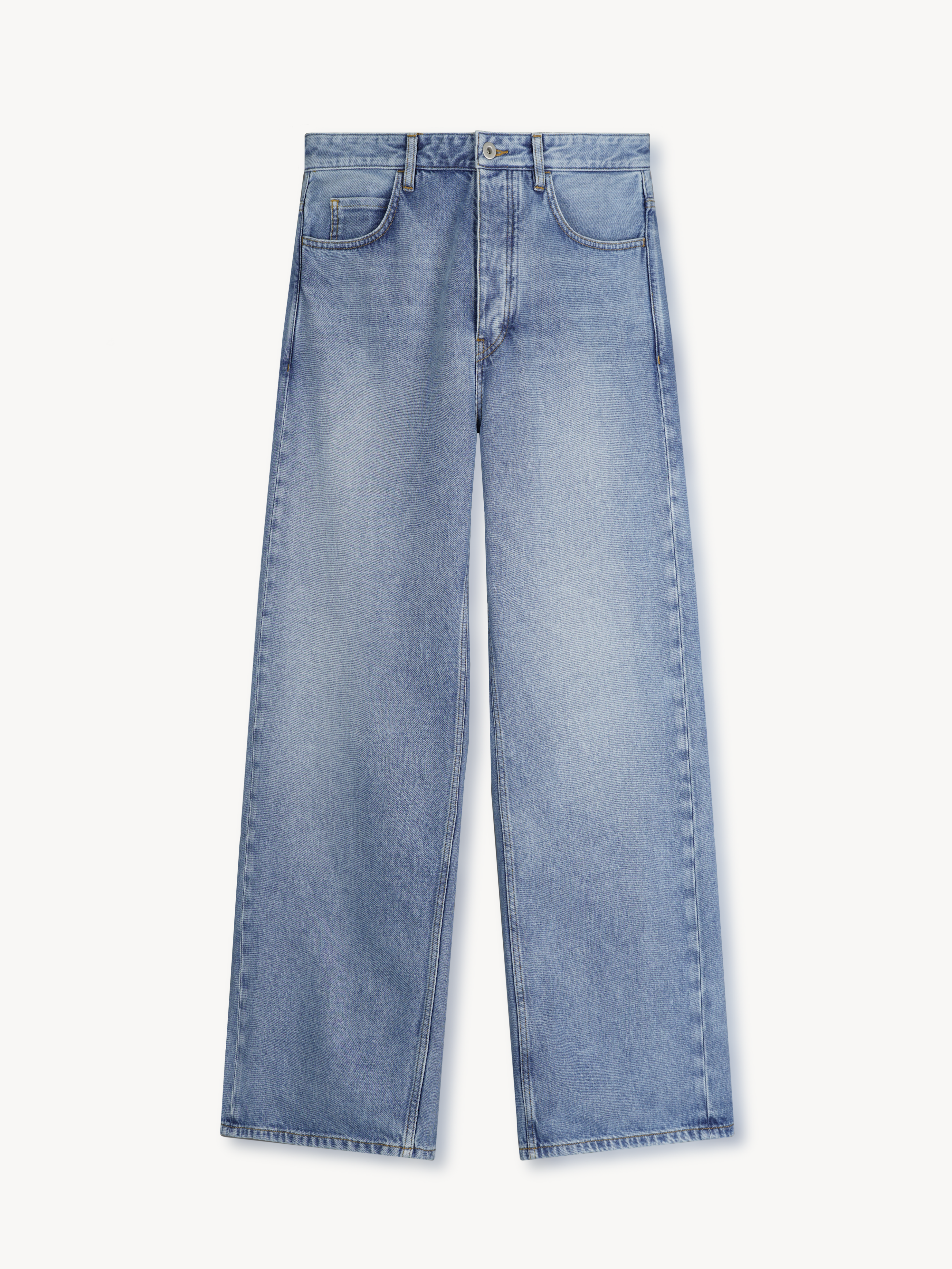 11oz wide leg Japanese denim. This garment is finished a special treatment for a soft and fluid texture.